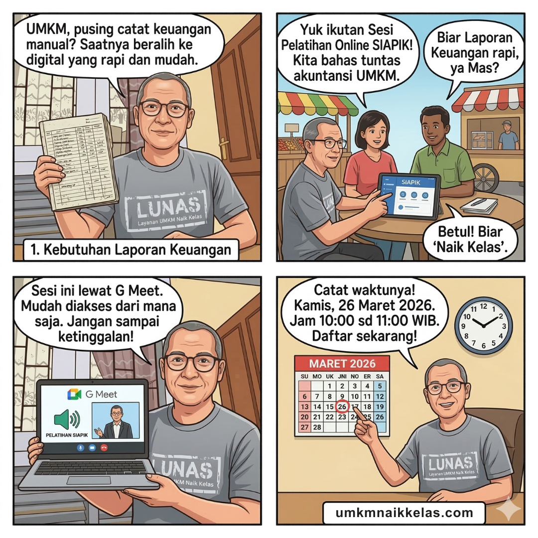 Halo Kawan LUNAS!Masih bingung bedain uang pribadi sama uang bisnis? Mau punya laporan keuangan serapi perusahaan besar tapi nggak mau bayar mahal?Yuk, ikutan pelatihan online SIAPIK bareng ahlinya, Pak Baskoro! ✨ GRATIS tanpa biaya pendaftaran! ✨📍 Via Google Meet 📅 Kamis, 26 Maret 2026 🕙 10.00 sd 11.00 WIBCukup 1 jam, ilmu manfaatnya seumur hidup buat bisnis kamu! Amankan kursimu sekarang!LANGKAH-LANGKAH:Masuk ke akun LUNAS AndaKlik tombol Daftar EventNama Anda akan tampil di Daftar PesertaKlik LINK MEDIA untuk gabung grup peserta